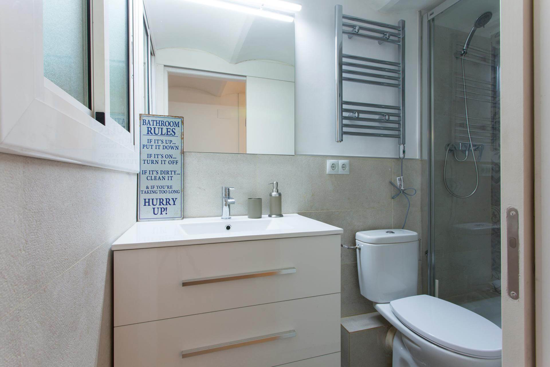 Walk in shower, vanity unit, large mirror and hand basin