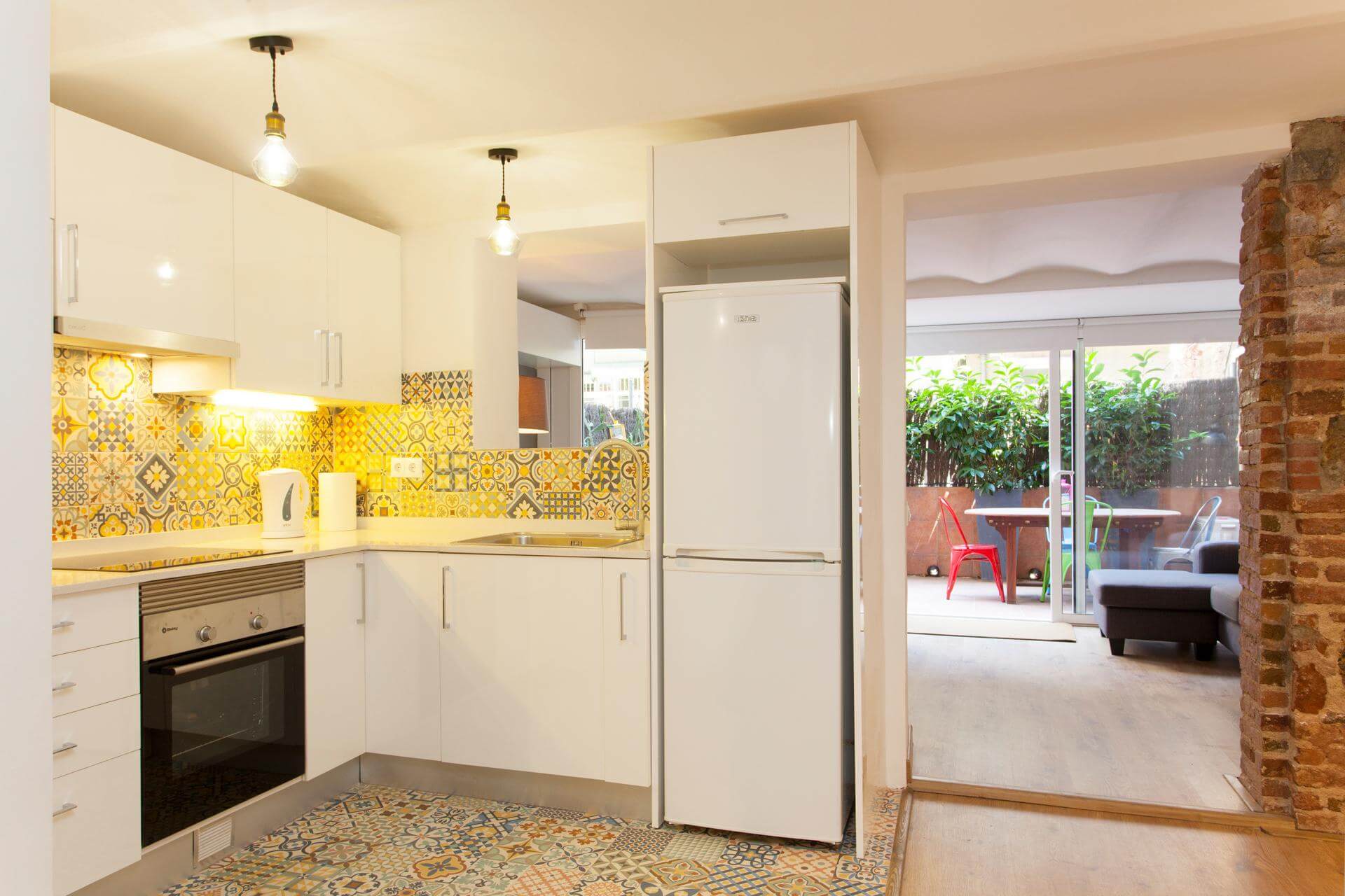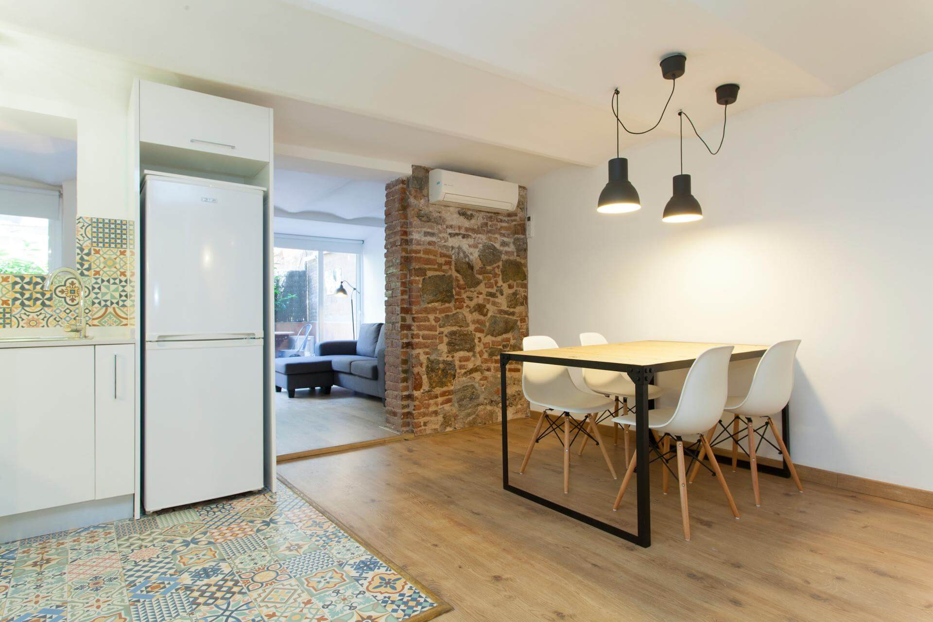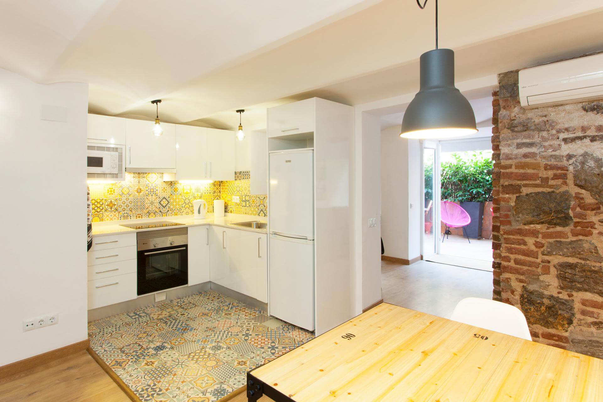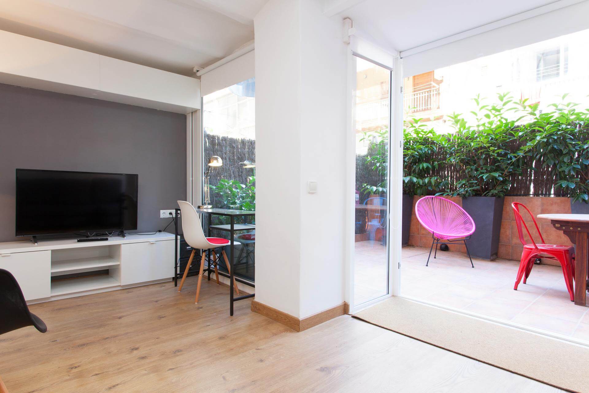 Enjoy morning coffee on the terrace with views of Sagrada Familia! You’ll enjoy this spacious 75 m2 ground floor 2 double bed apt with large private terrace. Fully refurbished to a very good standard with air conditioning and all modern amenities. A fully equipped kitchen, TV & Washing Machine is available. Located in a modernist building in the heart of Eixample with all local amenities on the doorstep. 10 Minutes walk to Plaça Catalunya, 2 minutes to the Metro L2 & L5.