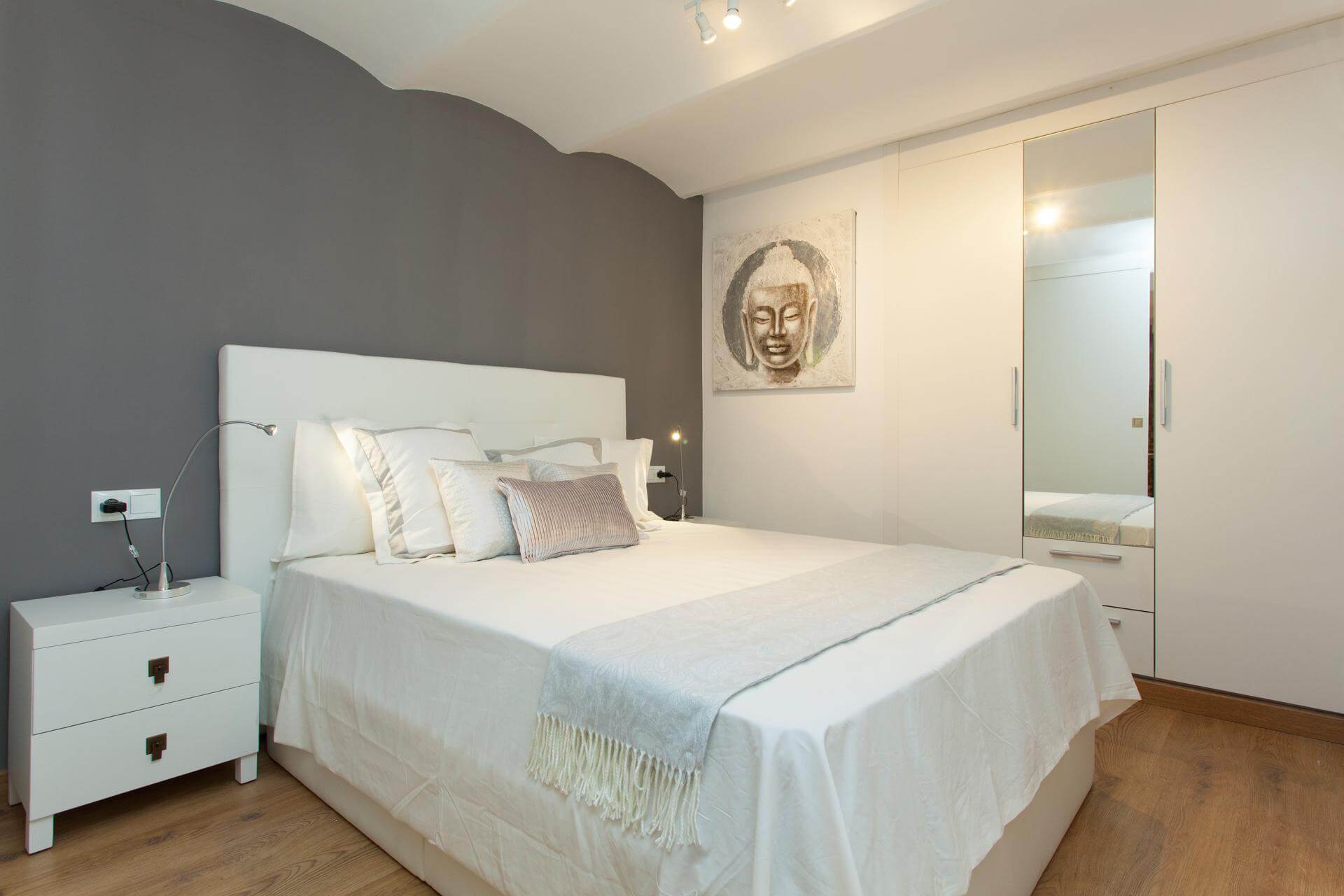 Doble bedroom with double bed, in built wardrobes, bedside lighting and quality bedding.
